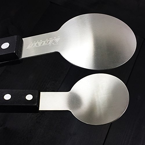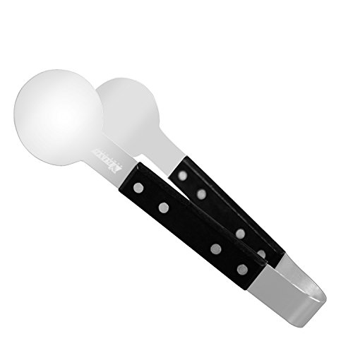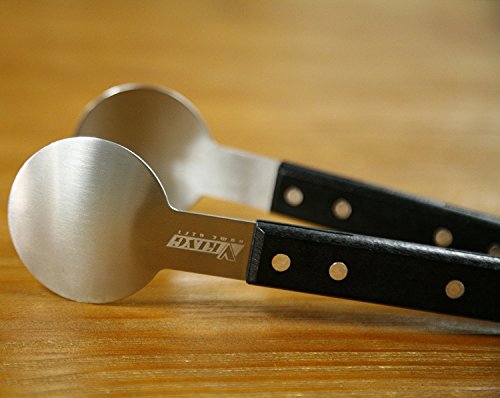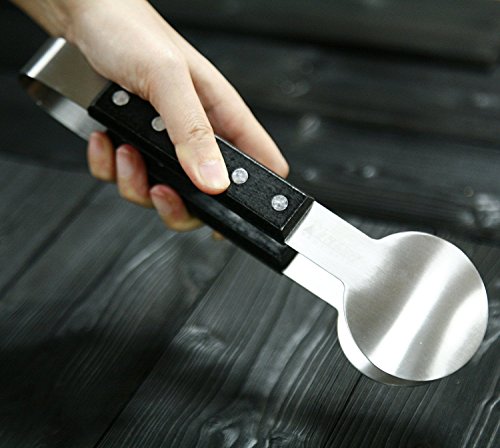 UNIQUE DESIGN: With a unique round head and hardwood handle ,9.5 Inches length ,this barbecue tongs is great for grilling steak.The stainless steel kitchen tongs have wooden grips, the heat resistant is better than silicone tongs.Also each side has 4pcs rivets to fix the handle for durability and safety .