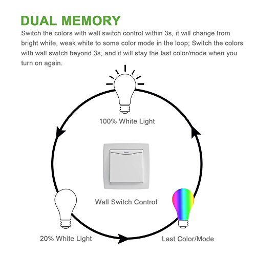 - DUAL MEMORY: The light bulb can memory the last color setting when turn off the wall switch more than 3s; Turn the wall switch on-off-on-off less than within 3s, modes changing: 100% bright white lighting mode--20% bright white light(energy saving/ nightlight mode)--the last lighting mode.