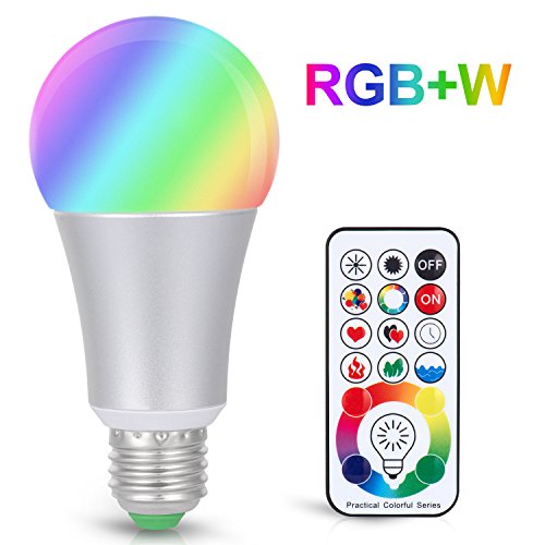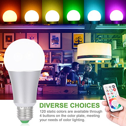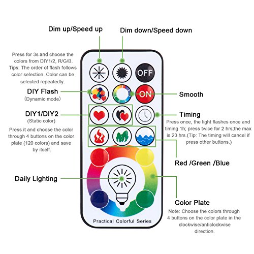 - RGBW LIGHT BULB: Color changing LED bulb with remote controller (included). You can DIY more than 120 static colors you want through 4 buttons on the color plate. Brightness can be dimmed too. Very easy to use and provide colorful and bright illumination.