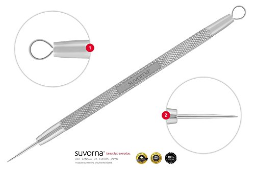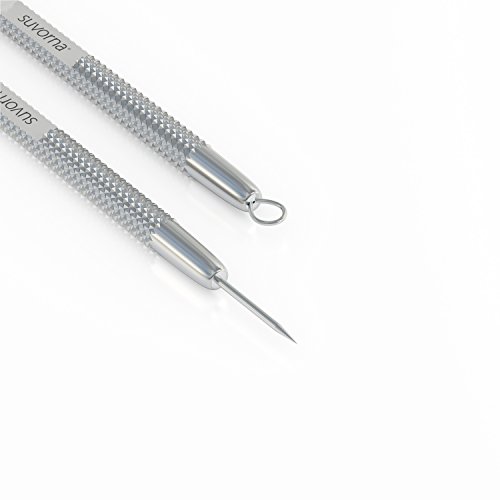 - SAFE EASY AND EFFECTIVE LANCET EXTRACTOR: Suvorna’s lancet extractor has very sharp needle on one end and open circle loop on other end to remove blemishes such as whitehead, pimples, milia and general comedones. This tool provides a perfect mix of thin wire loop for small whiteheads, blackhead and needle sharp lancet to poke a tiny hole. Extractor works effectively on nose, chin, forehead, cheeks and body acne, also has the ability to remove blemishes deep in the skin.