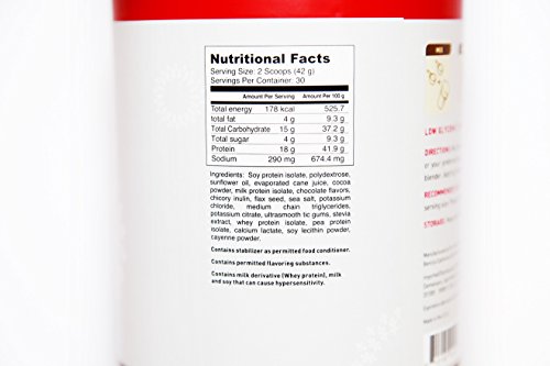 -. Feature : Designed as meal replacement , weight loss shake and dietary supplement to support longer curb cravings without a big hit of sugar / Healthy daily regimen , contains low-carb , low-fat and richest sources of BCAAs / Natural Ingredients , Gluten Free , GMO Free , Halal Certified , endorsed by the Chopra Center , 6+ Grams Fiber to supports curb cravings and 18g of Premium Protein to helps build lean muscle / Double-filtration process , various forms of purification and latest technology to produce the great protein powders and yet safe from impurities and contaminants / Easy on the go protein shake , available in chocolate and vanilla flavors , 21 grams of protein per scoop , 30 servings