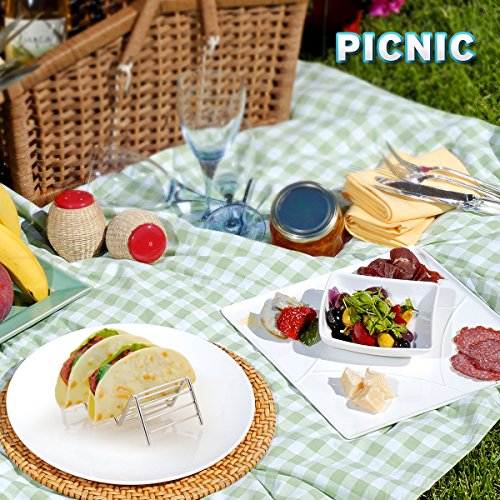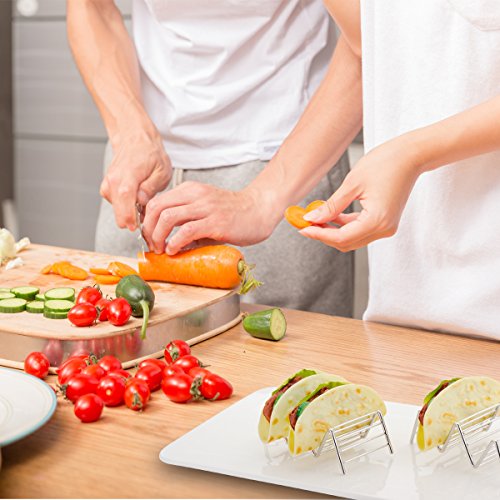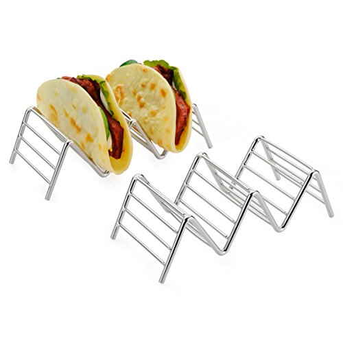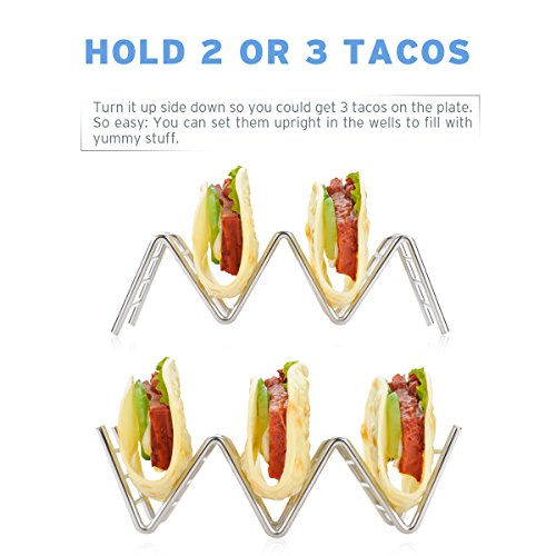 Item Specifications: 2 Metal Taco Holders 5.65" Length x 2.52" Width x 1.63" Height Each Material: food-safe Stainless Steel Rustproof, easy to clean Size: hold 2 or 3 tacos each, so 4-6 in total Oven Safe, Dishwasher Safe and Grill Safe Product Features Makes making tacos so much easier: You can set them upright in the wells to fill with yummy stuff. Oven Safe: You can put the taco holder in the oven to keep the tacos warm. Set of 2: It can hold 2 or 3 tacos each, so you can eat SIX tacos at once without rebuilding.
