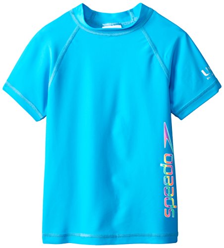 Speedo equals better fit, performance, quality, and innovation. The short sleeve rash guard swim tee is a great athletic style coverup with colorful contrast top stitching and is ideal for any outdoor activity. It features our exclusive UV block the burn technology, offering more body coverage, a tighter knit fabric for a higher level of protection, and an improved fit so that overstretched product does not decrease the UPF rating. This is the perfect coverup for playing in the pool, taking swim lessons, or while active at the beach. Look and feel your best in or out of the water, while you play, train or win in speedo, the choice of champions