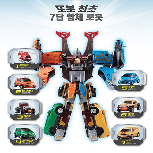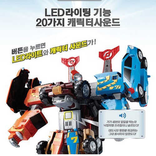 -. Feature : Seven Transformer Robot / LED Lighting and 20 kinds character sound / Equipped Giga Booster / Korean children's favorite toy characters. / Box size : 25.59" x 6.69" x 16.14"