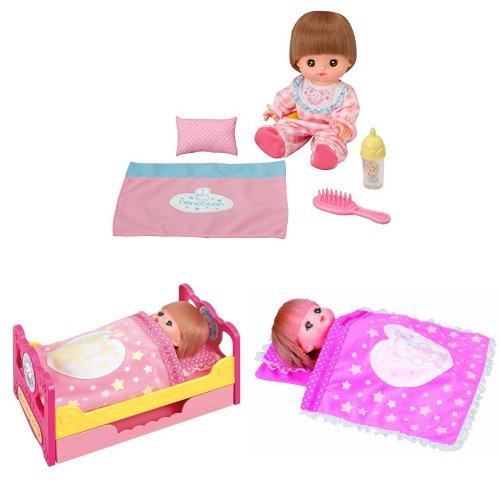 「おめめぱちくりネネちゃん」本体と「いっしょにおねんねベッド」「ピカピカおふとん」の3点セットです。