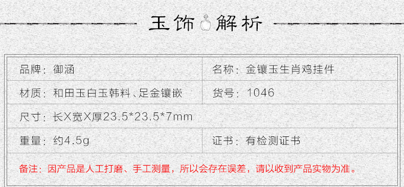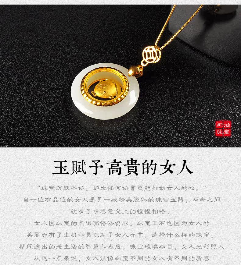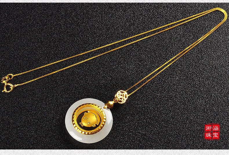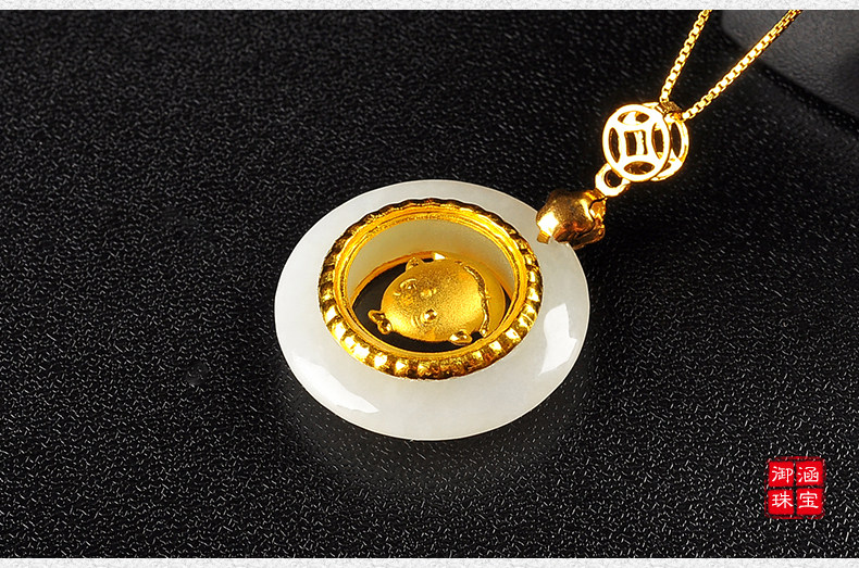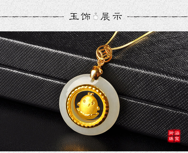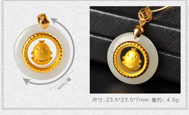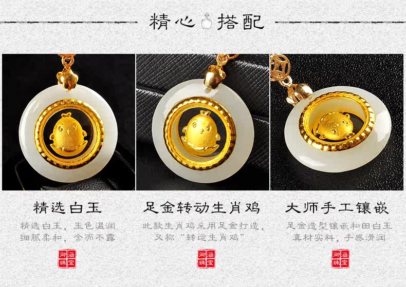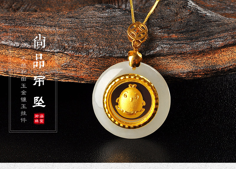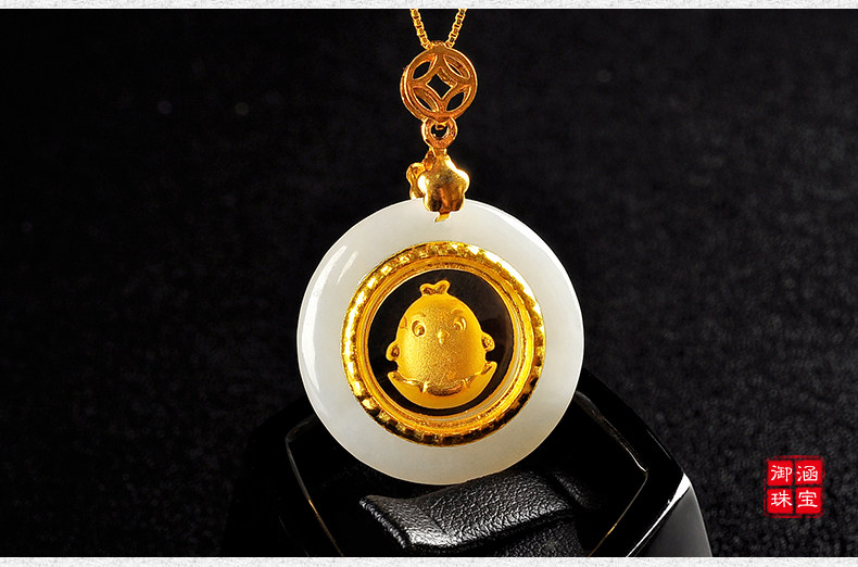 黄金镶玉吊坠 足金和田玉吊坠时来运转生肖鸡玉石挂件男女款