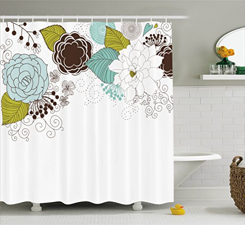 Spring Shower Curtain by Ambesonne, Ornamental Florets Blooms Romantic with Leaves Beauty Design, Fabric Bathroom Decor Set with Hooks, 84 Inches Extra Long, Dark Brown Seafoam Apple Green