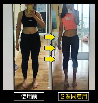 2週間着用のモニター様 ウエスト >>> -15.2cm ヒップ >>> -12.3cm 太もも >>> -8.3cm ふくらはぎ >>> -6.4cm |