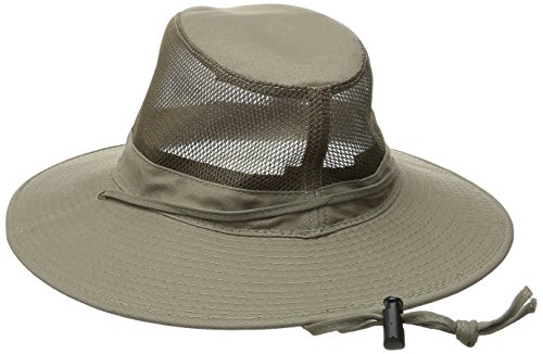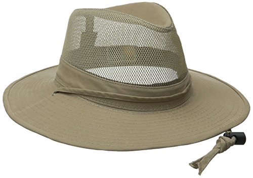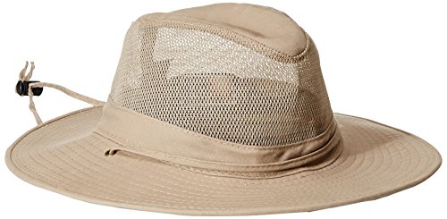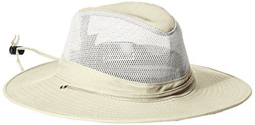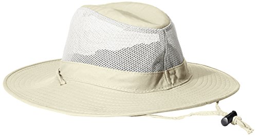 -. Feature : Mesh-paneled hat featuring wide channel-stitched brim and chin cord with toggle / UPF 50+ protection with coolmax sweatband