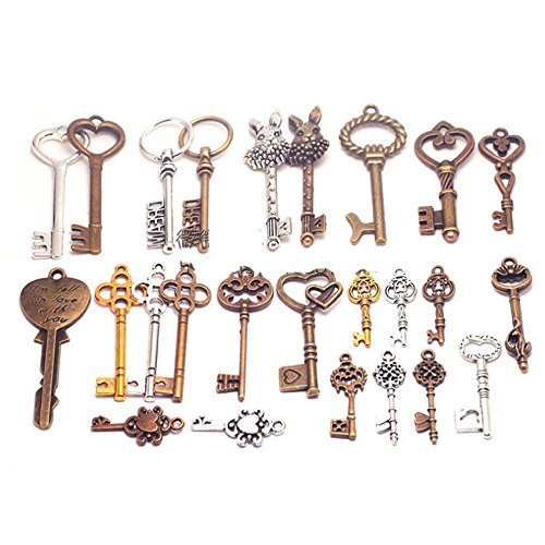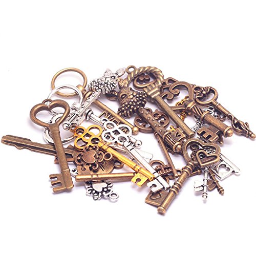 Bonayuanda Pack of 25 Mixed Antique Vintage Skeleton Keys Heart Bow Punk Charm Set Necklace Pendants