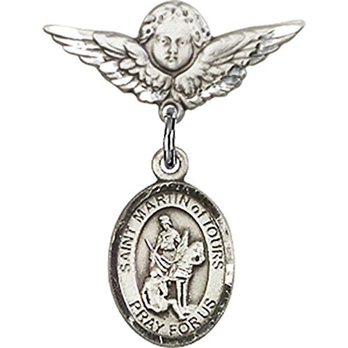 -. Title : Sterling Silver Baby Badge with St. Martin of Tours Charm and Angel w/Wings Badge Pin 7/8 X 3/4 inches