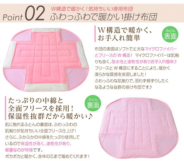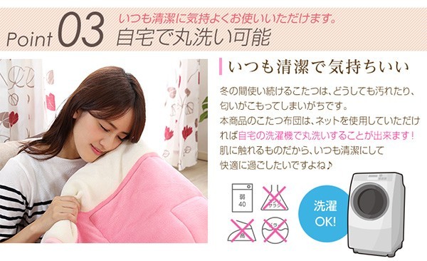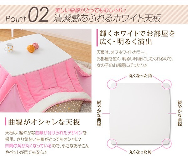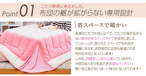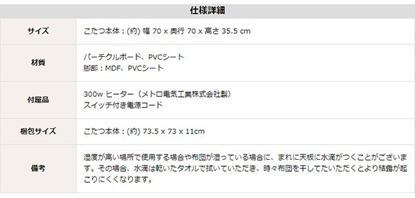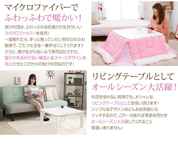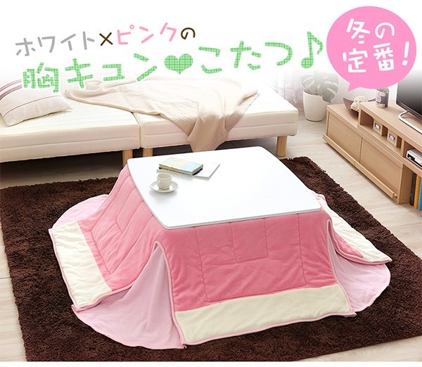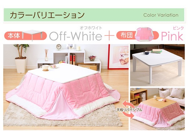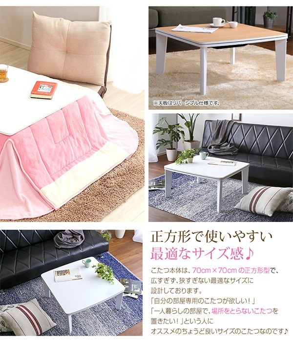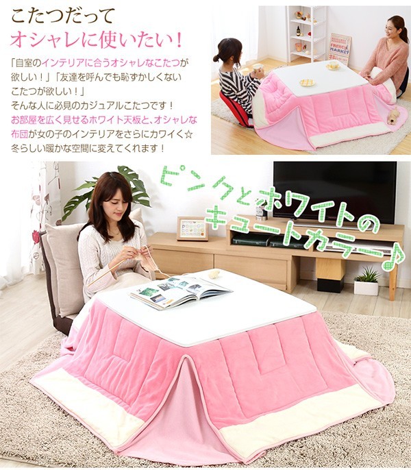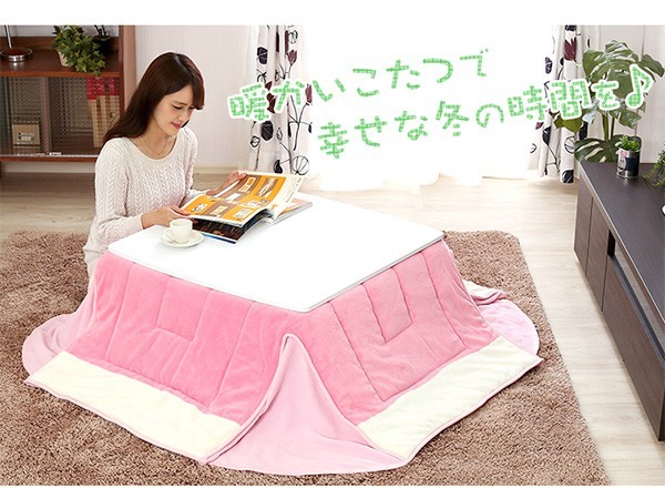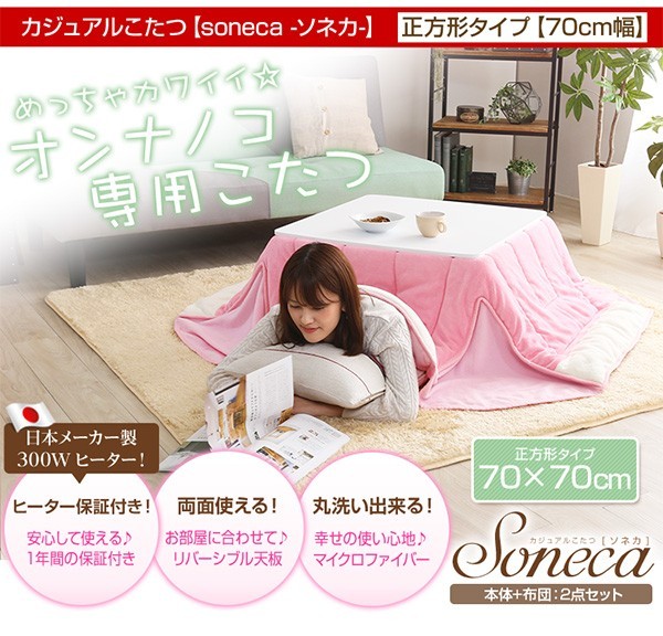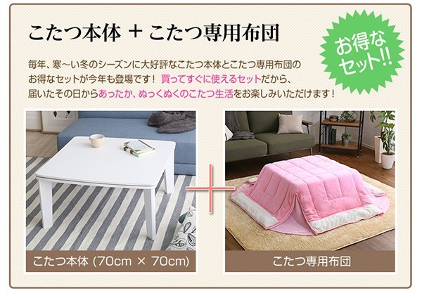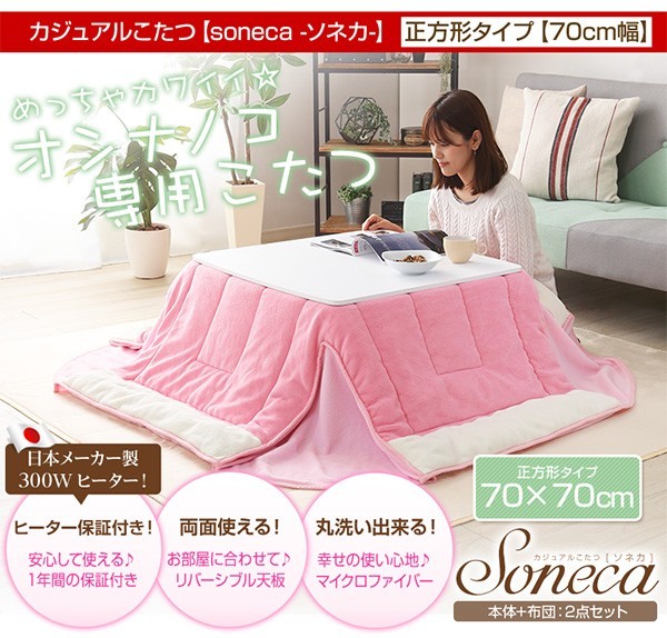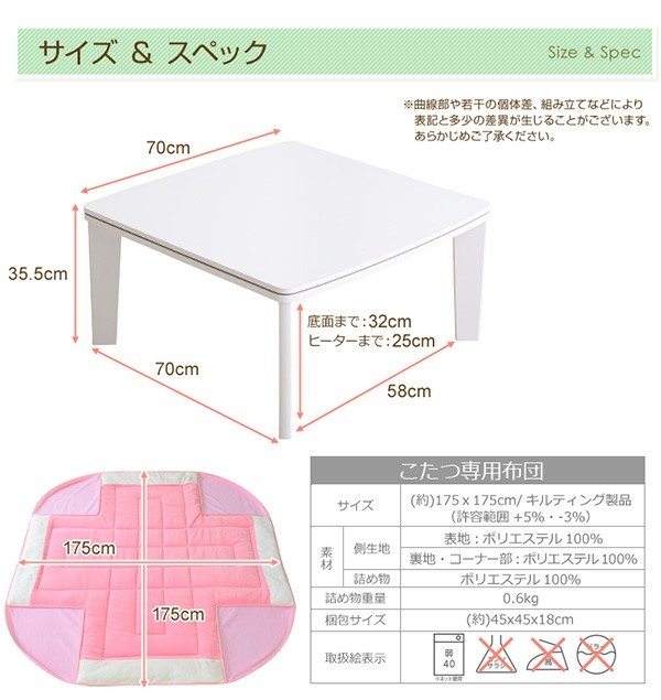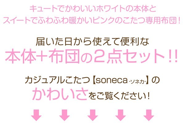 【商品について】カジュアルホワイトこたつ【-Soneca-ソネカ(正方形・70cm幅)】(こたつテーブル+掛布団の2点セット)■サイズ:本体外寸:(約)幅70x奥行70x高さ35.5cm(約)11.74kg布団:(約)幅175x奥行175cm(約)1.7kg■カラー:本体:ホワイト布団:ピンク■素材:天板:パーチクルボード、PVCシート脚:MDF、PVCシート※付属品:300Wヒーター(メトロ電気工業株式会社製)・無段階温度調節機能、温度ヒューズ付・スイッチ付き電源コード布団:表地、裏地、詰め物:ポリエステル100%※洗濯可能(ネット使用)■その他:・完成品でお届けします。※脚はお客様取付け本体:(約)73.5x73x11cm(約)12.6kg布団:(約)45x45x18cm(約)2.7kg