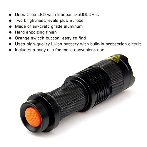 - Power : 18650 3.7v Battery ( included),This mini flashlight can use 18650 batteries.