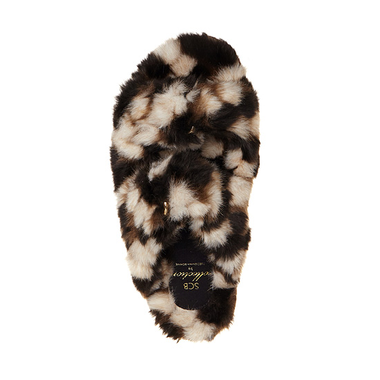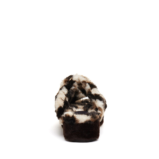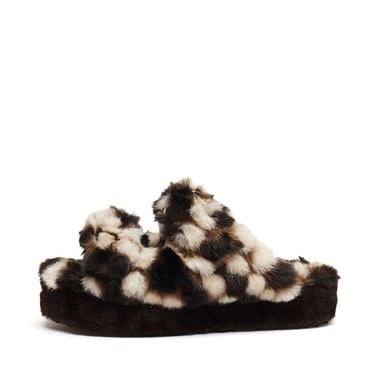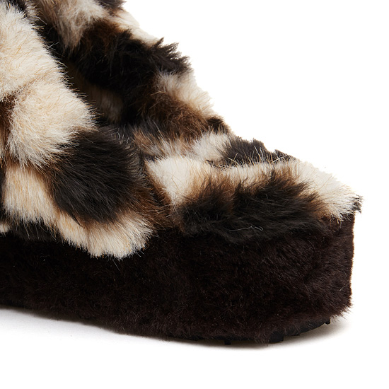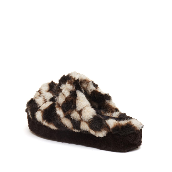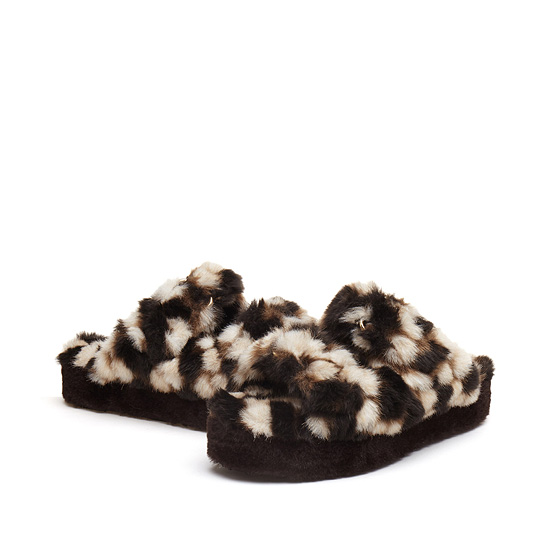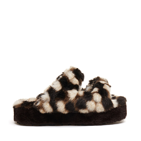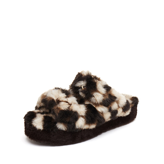 - 시즌성 소재를 사용한 벌키한 쉐입의 트랜디한 퍼슬리퍼.