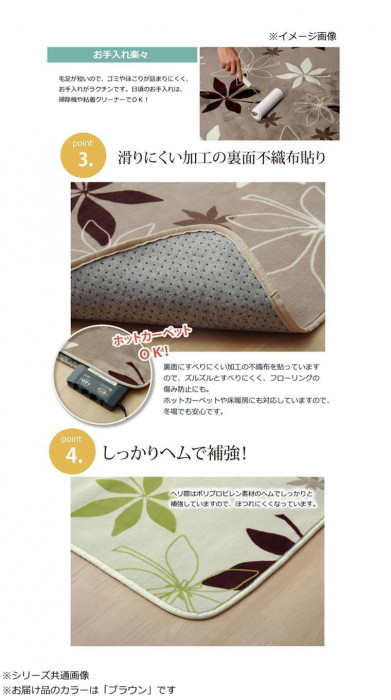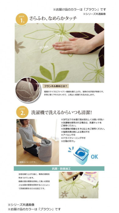 生地に抗菌・防臭加工を施したラグカーペットです。しっとりとして非常に柔らかいフランネル生地を使用しています。春夏はラグとして、冬場はホットカーペットカバーとして、オールシーズンご使用いただけます。 |