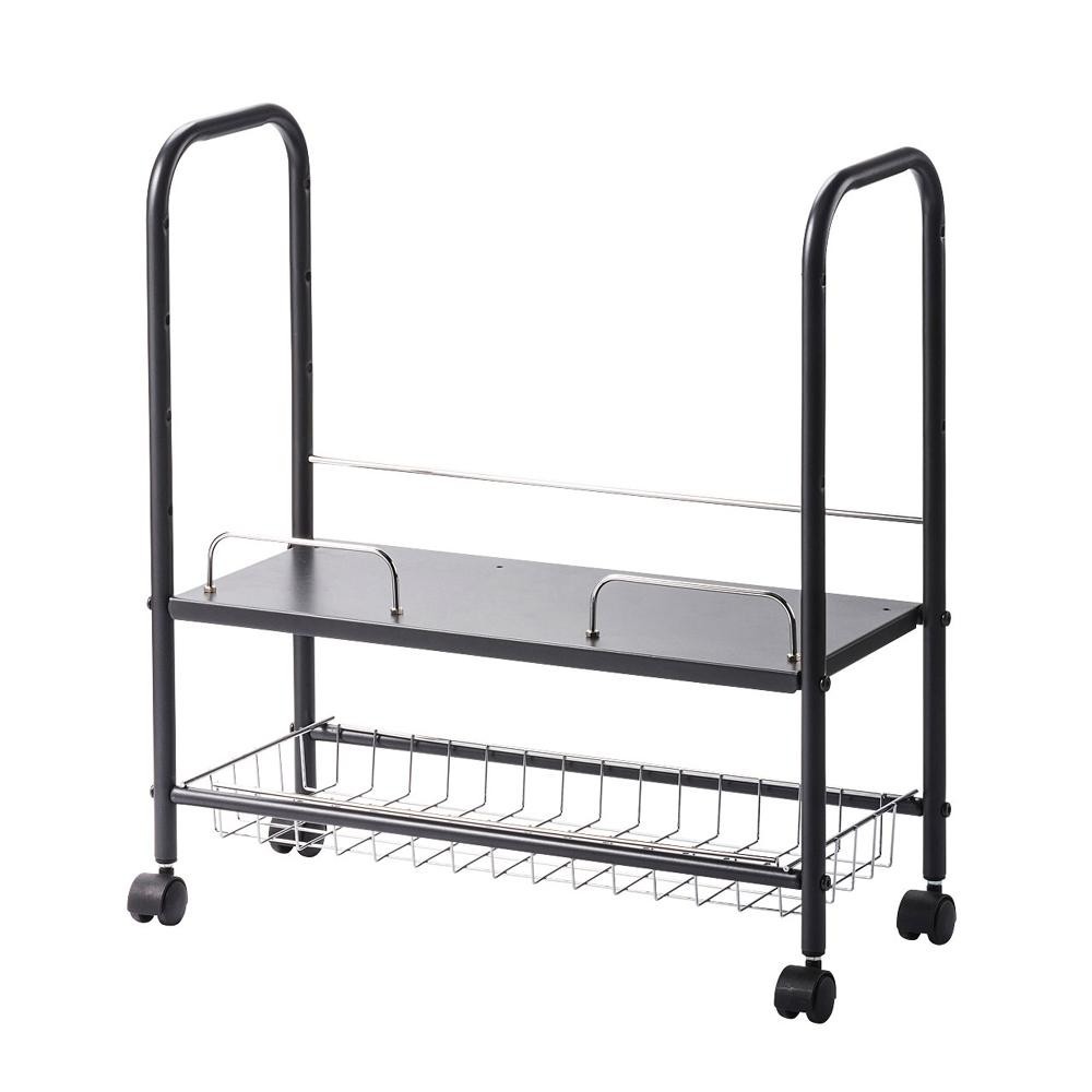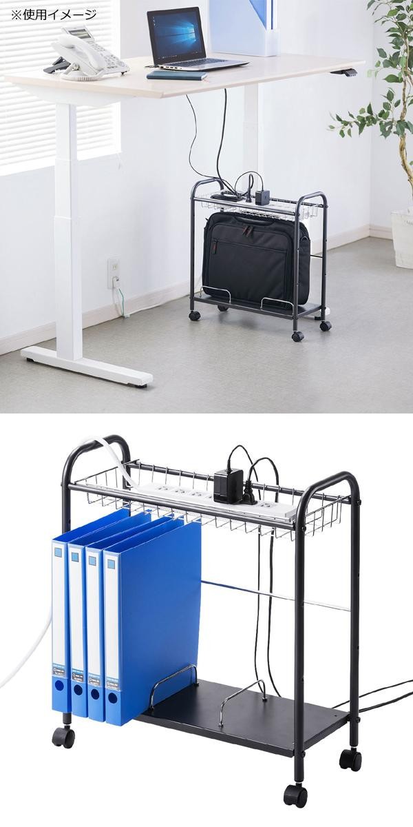 デスク周りの電源タップ、ケーブルなどがすっきり収納できるマルチワゴンです。ケーブル、タップを収納するカゴはワイヤーバスケット式になっており、ホコリがたまりにくい構造となっています。キャスター付きなのでデスク下から引き出す際、非常に楽に収納物が取り出せます。 |