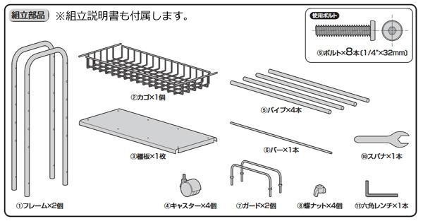 | 素材・材質 | フレーム:スチール(エポキシ樹脂粉体塗装) パイプ:スチール(エポキシ樹脂粉体塗装)+メッキ処理 ワイヤーバスケット:スチール(エポキシ樹脂粉体塗装)+メッキ処理 |