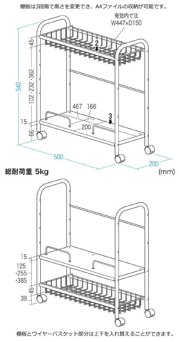 | サイズ | W500×D200×H540(キャスター含む)mm 個装サイズ:10×60×25cm |