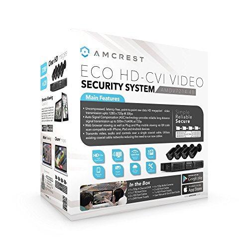 -. Feature : 4 High Definition 1.0 Megapixel 1280 TVL (720P) Heavy-Duty Metal Weatherproof IP67 Cameras for Amazing Video Quality and Clarity. Records 4CH 720P @ 30FPS & Playback 1CH 720P @ 30fps / 4Ch 720P @ 15fps. / 65ft Night Vision Automatically Activates When Low Light is Detected. Up to 1,640ft Transmission Distance from Cameras to DVR. Includes 2 x 60ft and 2 x 100ft Siamese cables & Power Supplies. / View and Record in Widescreen with Remote Viewing on iPhone, iPad and Android Devices (with included AmcrestView app). Remote Access on Windows PC and Apple Mac Using Standard Browsers (IE, Firefox, Safari) & Included Amcrest Surveillance Pro Desktop Software. / Pre-Installed 1TB Hard Drive (Expandable up to 4TB) for 15 Days Continuous Recording at Highest Resolution, Longer Recording Times Up To 60+ Days Available with Use of Motion Detection and/or Lower Resolution Settings. / Easy USB Backup Feature for Peace of Mind. DVR & Cameras CE & FCC Certified with UL Compliant Power Supplies. Full 1-Year US Warranty and Lifetime Support Provided Directly from Amcrest.