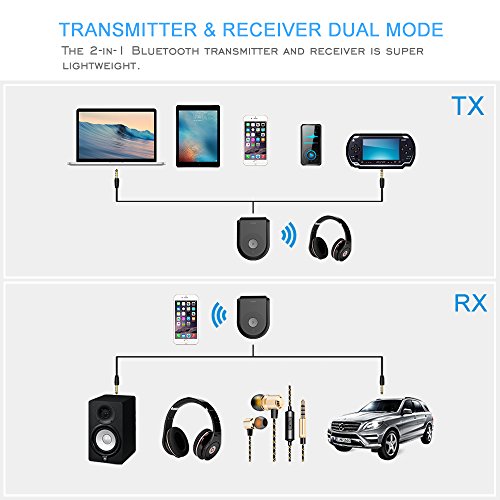 TRANSMITTER & RECEIVER TWO-IN-ONE -- The 2-in-1 Bluetooth transmitter and receiver is super lightweight. With the switch, it is able to used as a transmitter or receiver. TX for transmitter mode and RX for receiver mode.