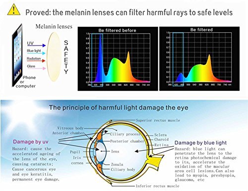 4.Superior melanoma lens technology Effectiveness Melanin lenses Filter layer: More than 50% harmful blue light filterFilter layer: Prevent 100% UV light Prevent harmful light, , Anti-Ultra-light relieve visual fatigue quickly slow down the degree of eye deepen