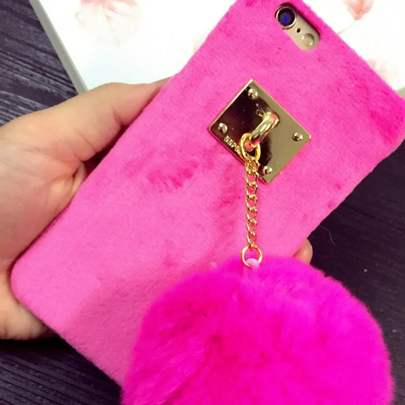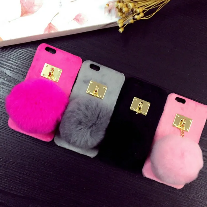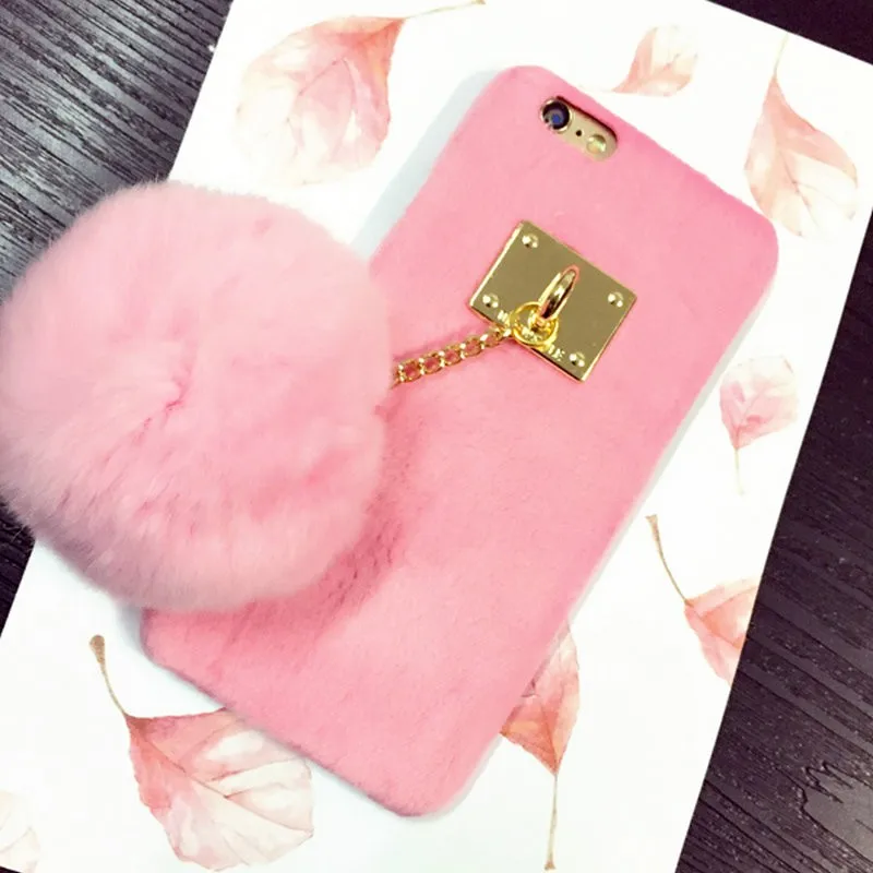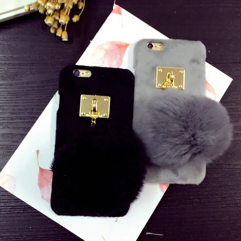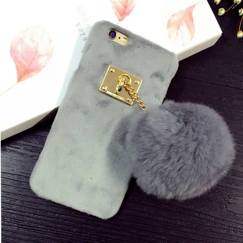 Warm Winter Luxury Gril Fur Ball Case Metal Ring plush phone case For iphone 7 6 6S plus 5 5S Hard back Coveru0026nbsp;