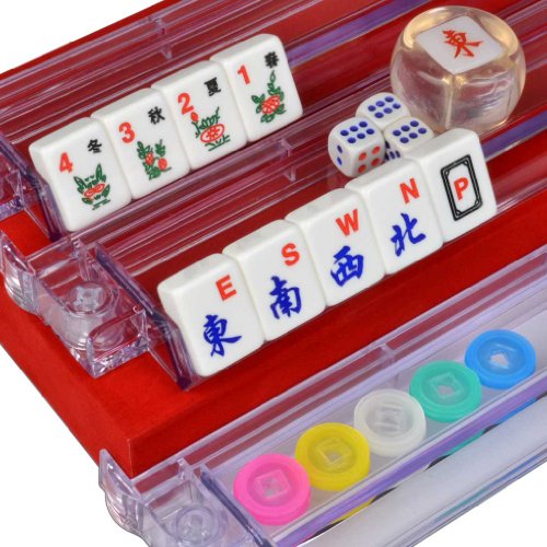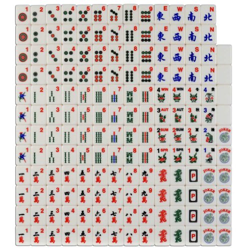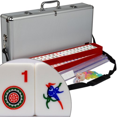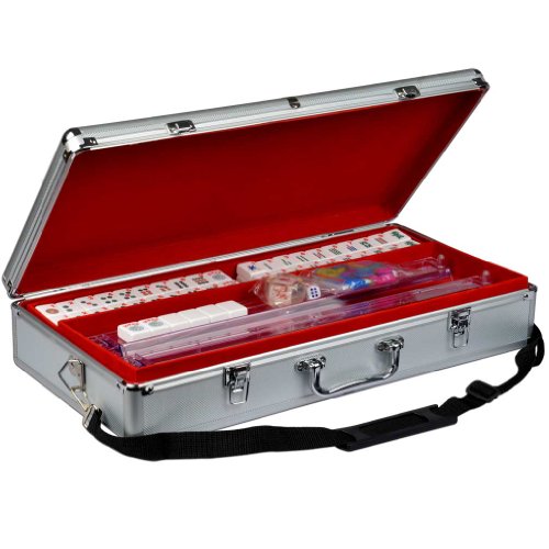 This set is made to be very easy on the eyes. The tiles have big and bold Arabic numerals in the corner for easy reading! Arranged similarly to a vintage Bakelite set, this American mahjong set has several innovations that will make it a pleasure to play. The case is made of strong, road worthy aluminum with shoulder straps for comfortable carrying. The mahjong tiles themselves are standard size, with crisp, colorful decorations engraved against an ivory white background. The trays and the inside of the case is lined with felt. This set has 166 tiles, including all the 144 tiles for classical Chinese play as well as an extra 22 tiles for the American version of the game. With this set you can comfortably play either version. To play the Chinese version simply use the red dragons as the 'hong zhong' and the green dragons as the 'fa' tiles.Feature