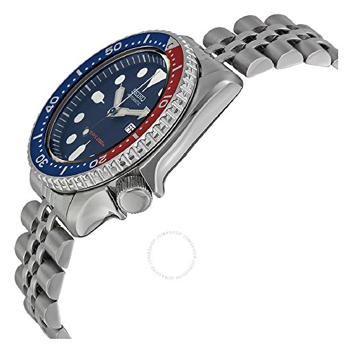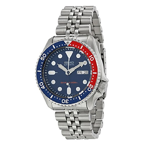 Battery-free automatic dive watch featuring two-tone unidirectional bezel and blue dial with day/date window and luminous hands/indices