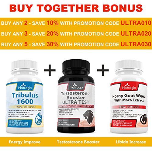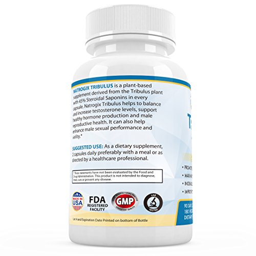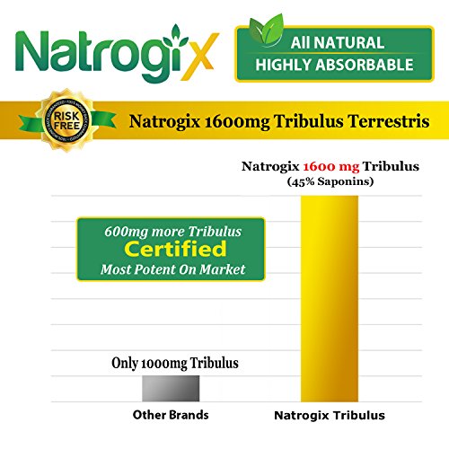 Feature : INCREASE SEX DRIVE AND MUSCLE GROWTH: Proven to naturally raise Testosterone levels, get ready to feel a massive boost in sex drive, muscle growth, fat loss and all around performance enhancement. / HIGHEST POTENCY: Undergoing third party testing Natrogix Tribulus was designed for maximum strength. Using the top range of 800mg per capsule and a potent 45% steroidal saponins extract we ensure your body absorbs every milligram and starts raising your testosterone on the first dose. / REPRODUCTIVE HEALTH: Studies have shown that Tribulus may also raise sperm count and increase virility, libido, and stamina. / BEST QUALITY: Natrogix's Tribulus is manufactured in a GMP certified facility to ensure top quality. Made in the USA and FDA approved you can rest assured you receive a safe and accurate product. / 100% MONEY BACK GUARANTEE! We are so confident in our product that we offer a full money back guarantee if you are not satisfied for any reason, no questions asked.