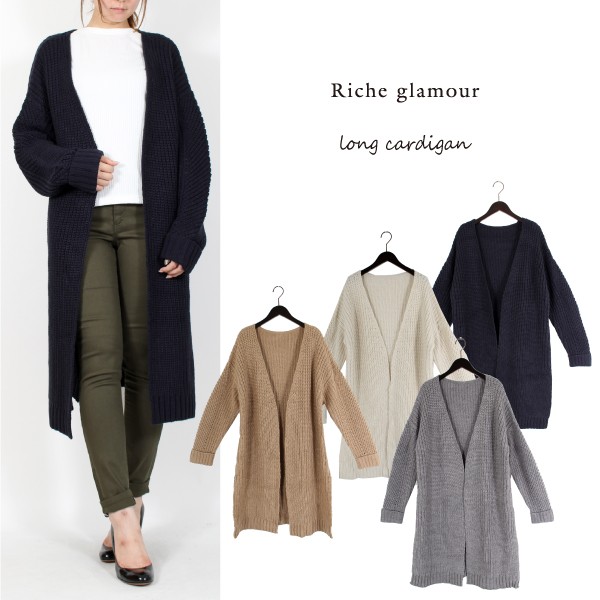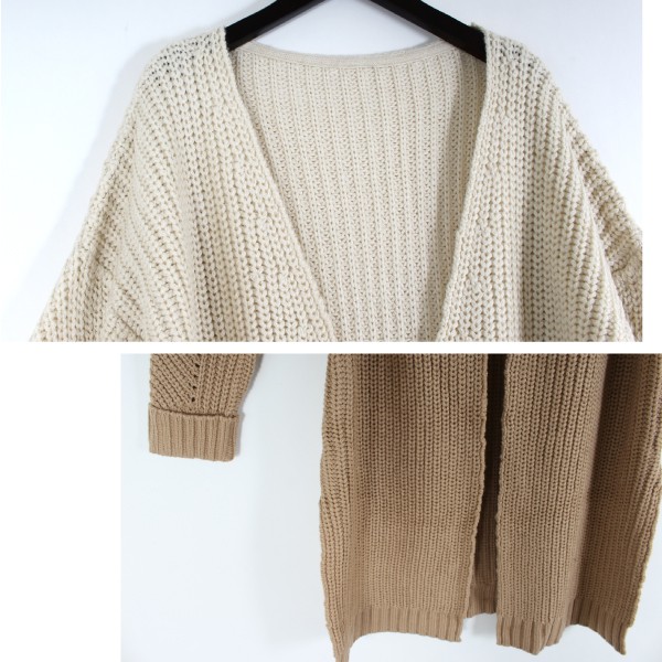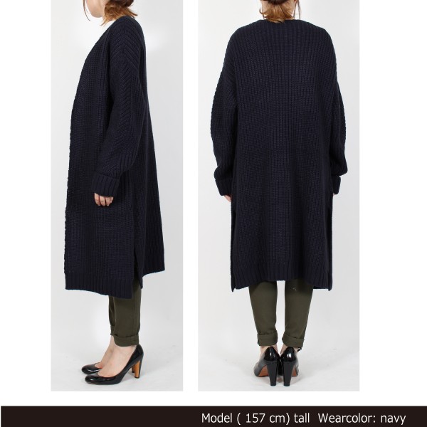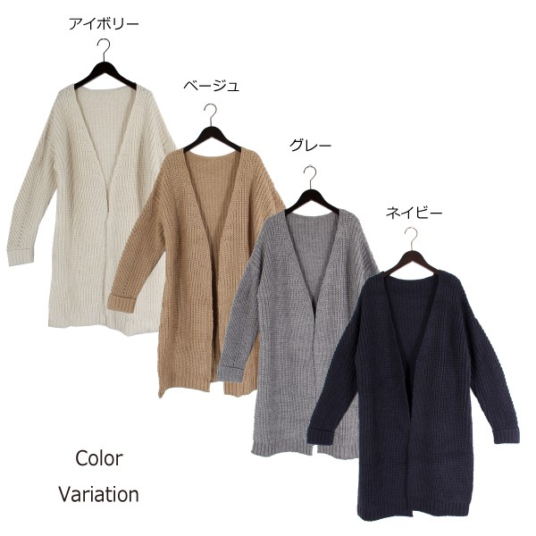 | サイズ | Mサイズ | | 実寸 | 着丈:90cm、肩幅:60cm、バスト:56cm、袖丈:41cm、袖口:10cm、裾巾:60cm | | 素材 | アクリル 100% | | 生産国 | 中国 | | 裏地 | なし | | 生地の伸縮 | なし | | 生地の透け感 | なし | | カラー | 01. アイボリー 02. ベージュ 03. グレー 04. ネイビー | | 注意点 | ▼綿混合商品は洗濯時に多少縮む事がございます。 ▼パソコン、モニター等の環境により、実際の商品素材カラーが多少異なる場合が御座います。予めご了承ください。 ▼お手数ですが必ずお買い物ガイドを一読頂いてからご利用いただきますようお願い申し上げます。 | |