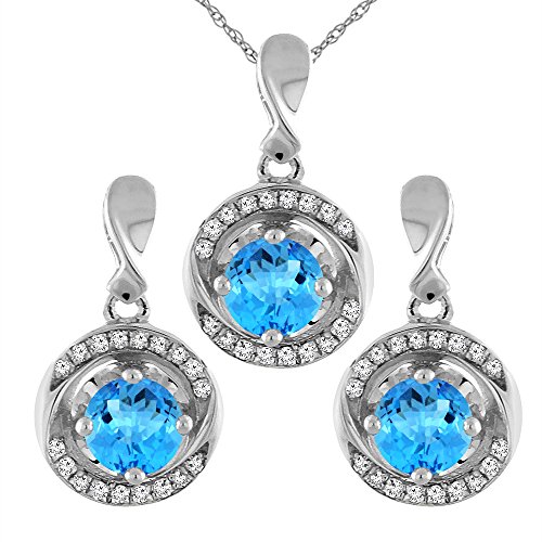 -. Binding : Jewelry -. Brand : Sabrina Silver -. Department : womens -. Feature : 14K Solid Gold / Naturally-vibrant, superior quality color gemstone / High Quality Genuine Diamond Accents / Complimentary gold chain included -. ProductGroup : Jewelry -. ProductTypeName : FASHIONOTHER -. Title : 14K White Gold Natural Swiss Blue Topaz Earrings and Pendant Set with Diamond Accents Round 4 mm