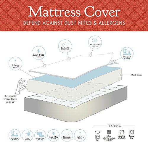 -. Feature : 100% Waterproof - repels all liquids including bodily fluids, perspiration, urine and accidental spills / Hypoallergenic soft knitted surface and polyurethane backing inhibits allergy-causing dust mites and bacteria from living in your mattress / Great For Those With Kids, Pets, Allergies, Asthma, Eczema Or Incontinence / Machine Washable / Fits mattresses 8"-24" in height and completely covers the mattress for added protection.