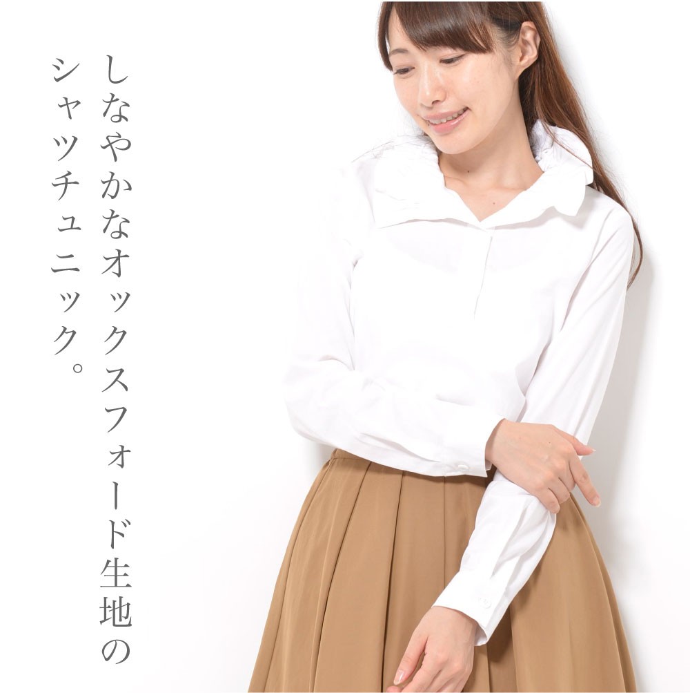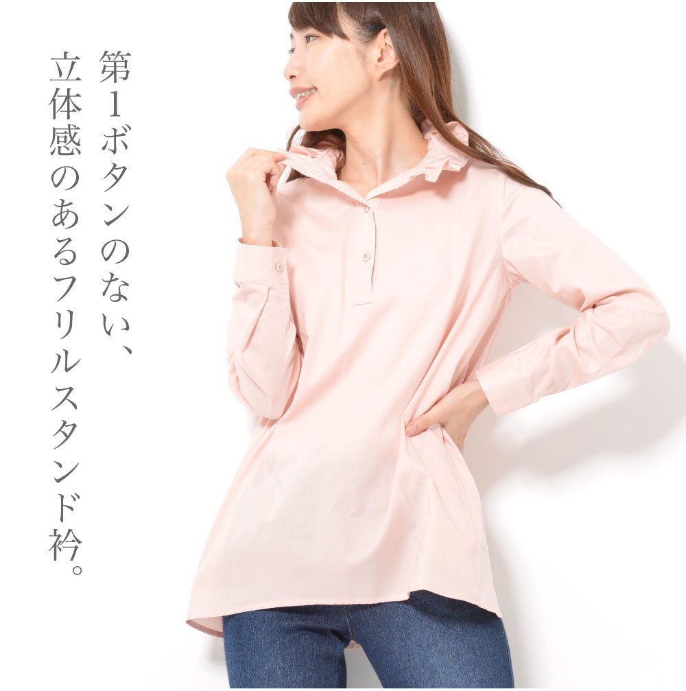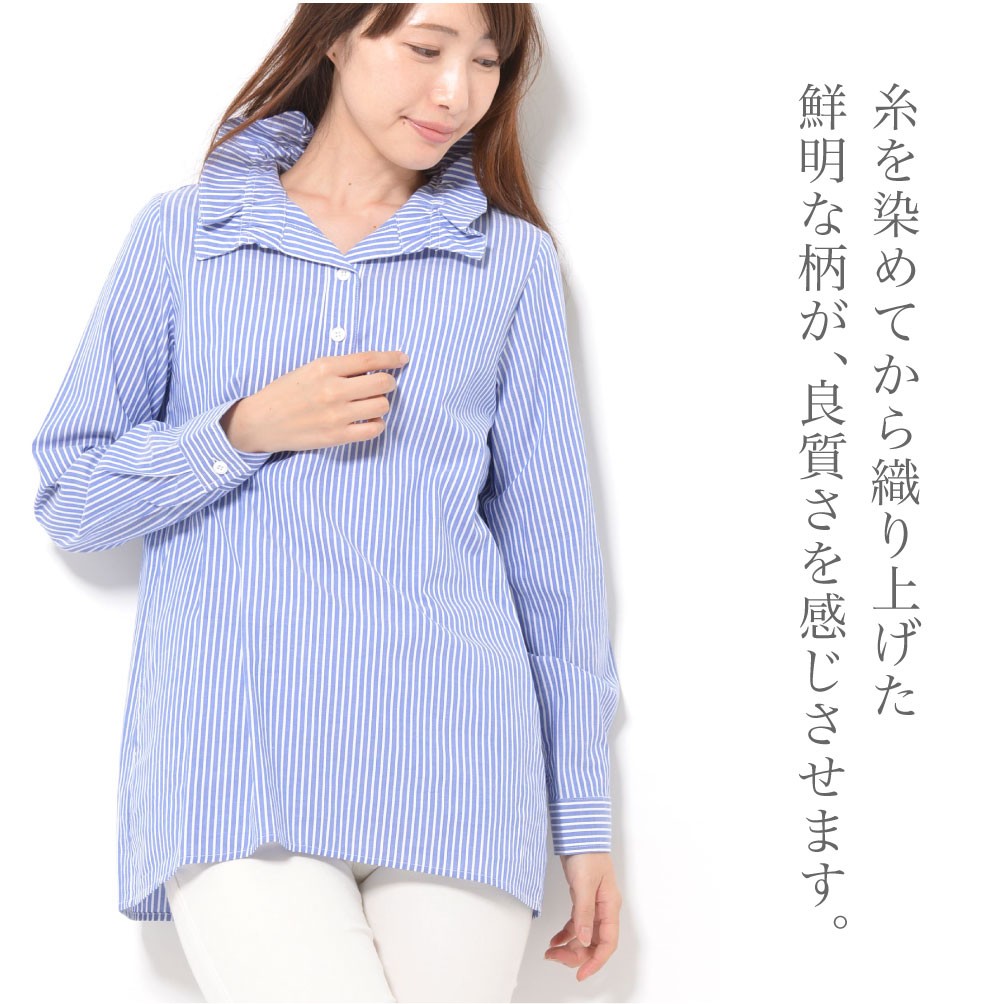 糸を染めてから織り上げた鮮明な柄が、良質さを感じさせます。第1ボタンのない、立体感のあるフリルスタンド衿。