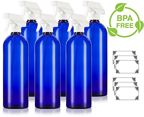 Cobalt Blue 32 oz Large Boston Round PET Bottles (BPA Free) with White Heavy Duty Industrial Trigger Sprayer (6 pack) + Labels