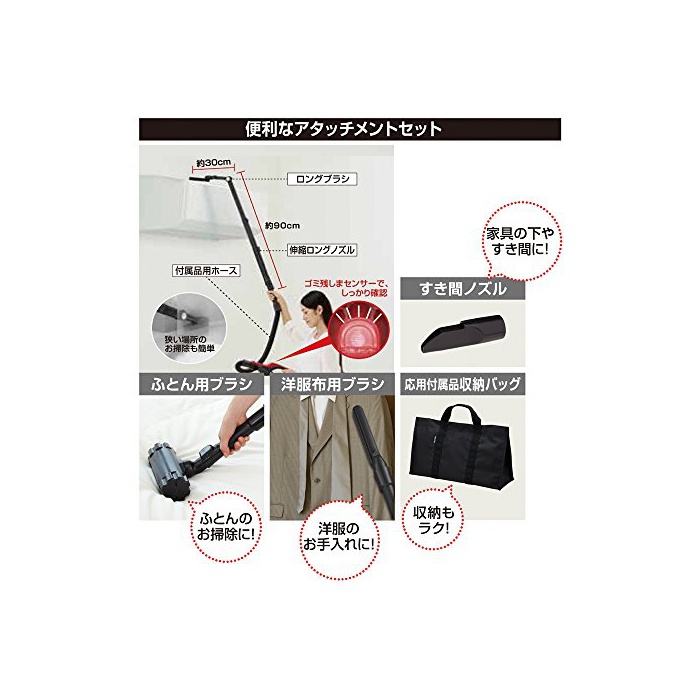 부속품:신축 노즐,부속품용 호스,롱 브러시,양복포 용브러시,이부자리용 브러시,틈 노즐,손질 브러시,응용 부속품 수납 가방