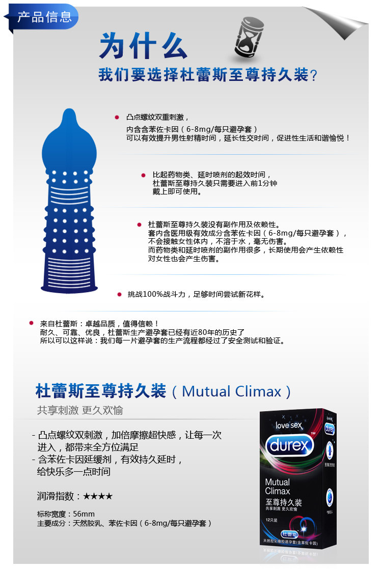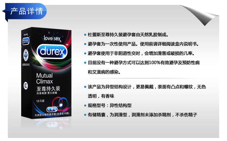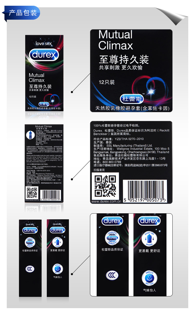 Product Name: Durex Extreme durable package total quantity (pieces): 12 Origin: China Approval Number: SFDA (into) the word 2011 No. 3660373 Material: latex Nominal Size: Large thickness: General appearance shape : Surround thread features: delay type flavor: Vanilla brand: Durex / Durex Model: Extreme durable equipment