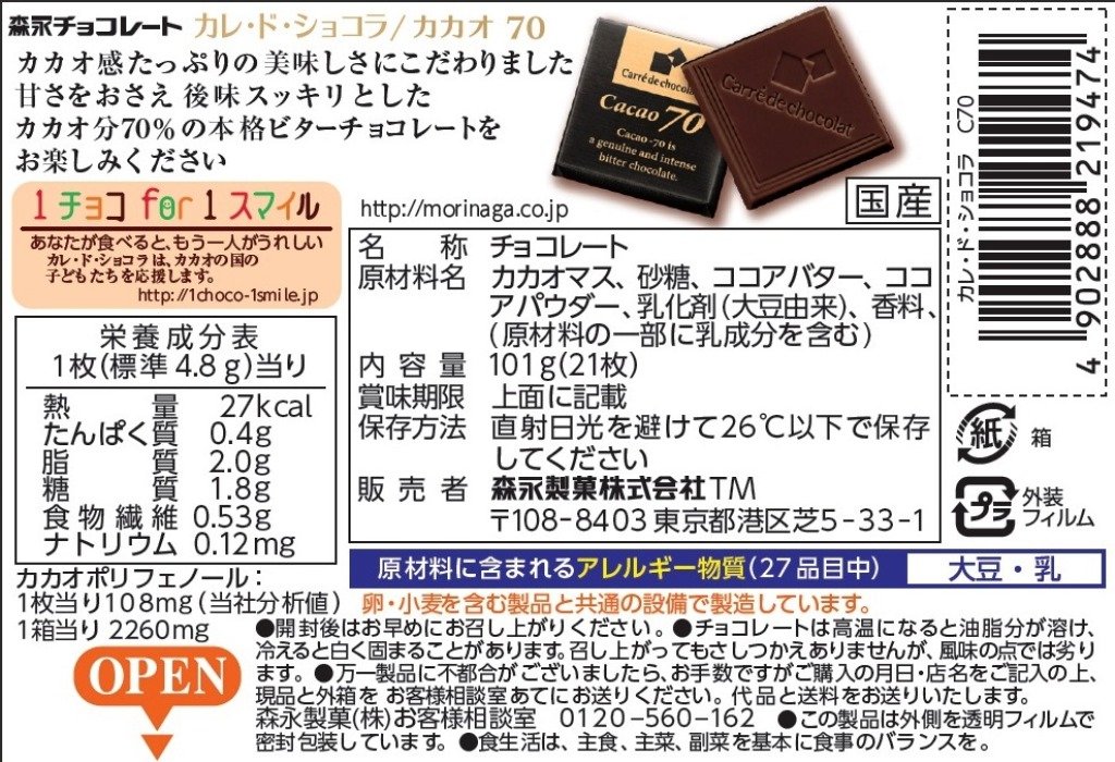原材料:カカオマス、砂糖、ココアバター、ココアパウダー、乳化剤(大豆由来)、香料 、(原材料の一部に乳成分を含む)
