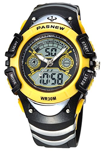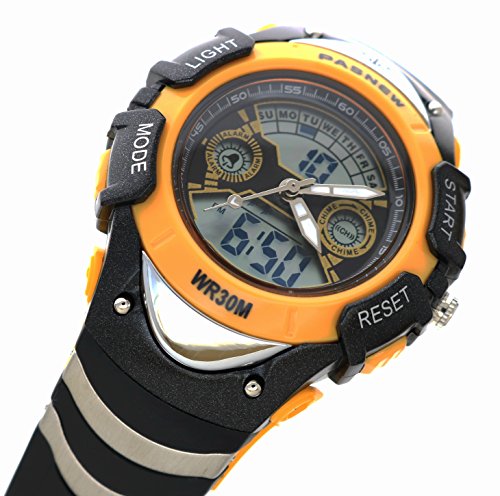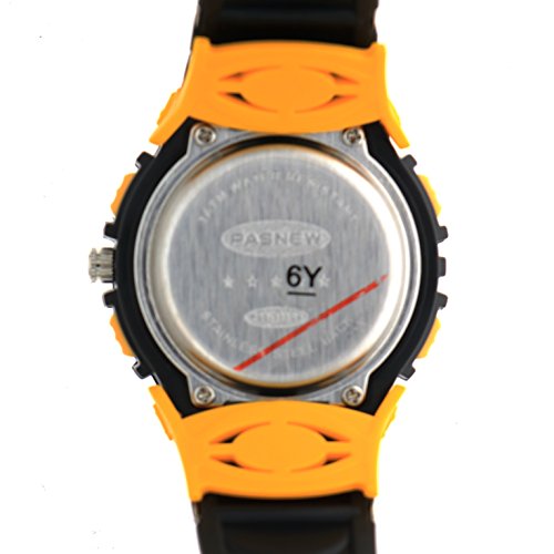-. Feature : 1.PRECISE TIME KEEPING: Japanese Quartz and Electronic High quality movement, Analog & digital display, provide precise and accurate time keeping.Long Battery Life. / 2.COMFORT: High Quality Germany Imported PU Resin Strap, the strap is soft and comfortable and environmental friendly.Suitable for wrist 14cm - 19cm. Safe and non-toxic plastic strap, no harm to children's Skin. It is also very suitable for outdoor sports. / 3. WATERPROOF FOR DAILY USE: 3ATM, 30M Water Resistant, HANDWASH, SWIMMING, NO PROBLEM ! Feel free to wear the watch when you are showering, swimming. NOTE: Please DO NOT press any buttons in the water or wear this watch for longtime underwater activities - such as diving, ect. Too much water contact or usage in extreme Hot or Cold temperature will shorter watch life. / 4.HIGHLY TRANSPARENT RESIN GLASS: The glass is made from the highly clear resin material imported abroad and sealed with the case by high frequency machine. So that the glass is extremely hard and pressure-tolerant. / 5. MULTI-FUNCTIONAL: Design Calendar Date Window, Time/date, 12/24 hour format, 30M Waterproof, Noctilucent, EL Back Light Display, Shock Resistant, Stopwatch.Easy to set up. It is able to operate it by children own. Nice watch for elementary age kids.Best present for your kids.