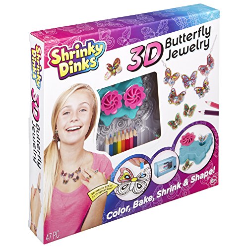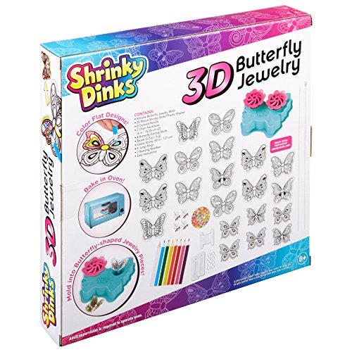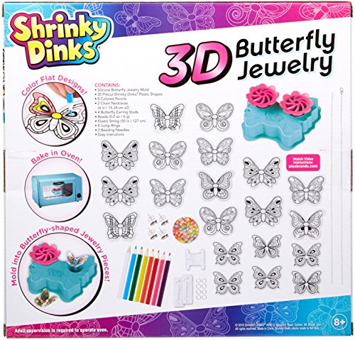 ReleaseDate : 2017-06-20 Studio : Alex Publisher : Alex Binding : Toy Product Description Shrinky Dinks 3D butterfly jewelry lets you choose spectacular colors for butterflies as you shrink them! the new silicone mold shapes the pieces into butterflies as they shrink, adding a new dimension to the classic craft. Color and shrink your pre-cut, pre-printed butterflies to make necklaces and earrings. Includes silicone butterfly jewelry mold, 20 precut and preprinted Shrinky Dinks, 8 colored pencils, 2 chain necklaces (6in/ 15.4cm each), 4 butterfly earring studs, beads (0.2oz/ 6G), elastic string (50in/ 127cm), 2 beading needles, 8 jump rings and easy instructions. Recommended for children 8 years of age and older. 0