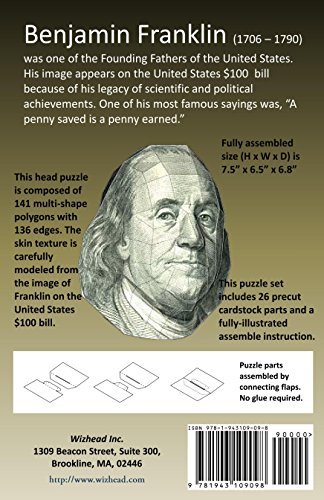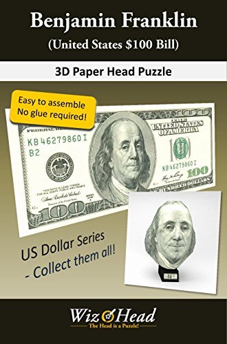 -. Binding : Toy -. Brand : Wizhead -. EAN : 9781943109098 -. Feature : 26 precut puzzle pieces; Fully assembled size (H x W x D) is: 7.5" x 6.5" x 6.8" / Composed of 141 multi-shape polygons with 136 edges The skin texture is carefully modeled from the image of Franklin on the United States $100 bill / Puzzle pieces connected by joining flaps; NO GLUE REQUIRED! / Time required: ~ 60 min / Assembly instruction is included -. IsAdultProduct : 0 -. ISBN : 1943109095 -. Label : Wizhead, Inc -. Manufacturer : Wizhead, Inc -. Model : C-USD00007-S -. MPN : C-USD00007-S -. PackageQuantity : 1 -. PartNumber : C-USD00007-S -. ProductGroup : Toy -. ProductTypeName : TOYS_AND_GAMES -. Publisher : Wizhead, Inc -. Studio : Wizhead, Inc -. Title : Wizhead US $100 Bill - Benjamin Franklin 3D Paper Puzzle -. Warranty : 30 day warranty against manufacturer defects