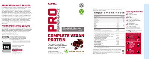 -. Binding : Health and Beauty -. Brand : GNC -. EAN : 0048107177805 -. Feature : Plant-Based Protein & Fiber To Support Satiety And Digestion / Vegan Aminos To Fuel Muscle Growth & Repair / Pro Performance Results / Complete Vegan Protein Provides 20 Grams Of Plant-Based Protein That Is Complete With All 9 Essential Amino Acids And Whole-Food-Based Blends To Help As You Strive For Optimum Health And Exercise Performance. Whether You Want To Enhance Your Post-Workout Muscle Recovery Or Satisfy Your Hunger, You Can Use This Delicious And Complete Protein To Meet Your Nutritional Needs. / Complete Vegan Protein Also Provides 8 Grams Of Essential Amino Acids, Which Are Needed To Build The Various Proteins Used In The Growth And Repair Of Body Tissues Such As Skin, Bones And Muscle. This Formula Features 13 Grams Of Clean, High-Quality Carbs For Sustained Energy And 2 Grams Of Hunger-Satisfying Fiber. And It Includes Clinically Proven Beet Extract To Enhance Athletic Performance. -. Label : GNC -. Manufacturer : GNC -. MPN : 369874 -. PackageQuantity : 1 -. PartNumber : 369874 -. ProductGroup : Health and Beauty -. ProductTypeName : HEALTH_PERSONAL_CARE -. Publisher : GNC -. Size : 2.5 lb(s) -. Studio : GNC -. Title : GNC Pro Performance Complete Vegan Protein - Natural Chocolate -. UPC : 048107177805