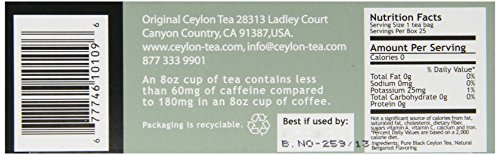 -. Binding : Grocery -. Brand : The Original Ceylon Tea Company -. EAN : 0677746101096 -. Label : The Original Ceylon Tea Company -. Manufacturer : The Original Ceylon Tea Company -. MPN : 10109 -. NumberOfItems : 1 -. PackageQuantity : 6 -. PartNumber : 10109 -. ProductGroup : Grocery -. ProductTypeName : GROCERY -. Publisher : The Original Ceylon Tea Company -. ReleaseDate : 2006-11-13 -. Studio : The Original Ceylon Tea Company -. Title : The Original Ceylon Tea Company, Earl Grey Tea, 25-Count Tea Bags (Pack of 6) -. UPC : 677746101096