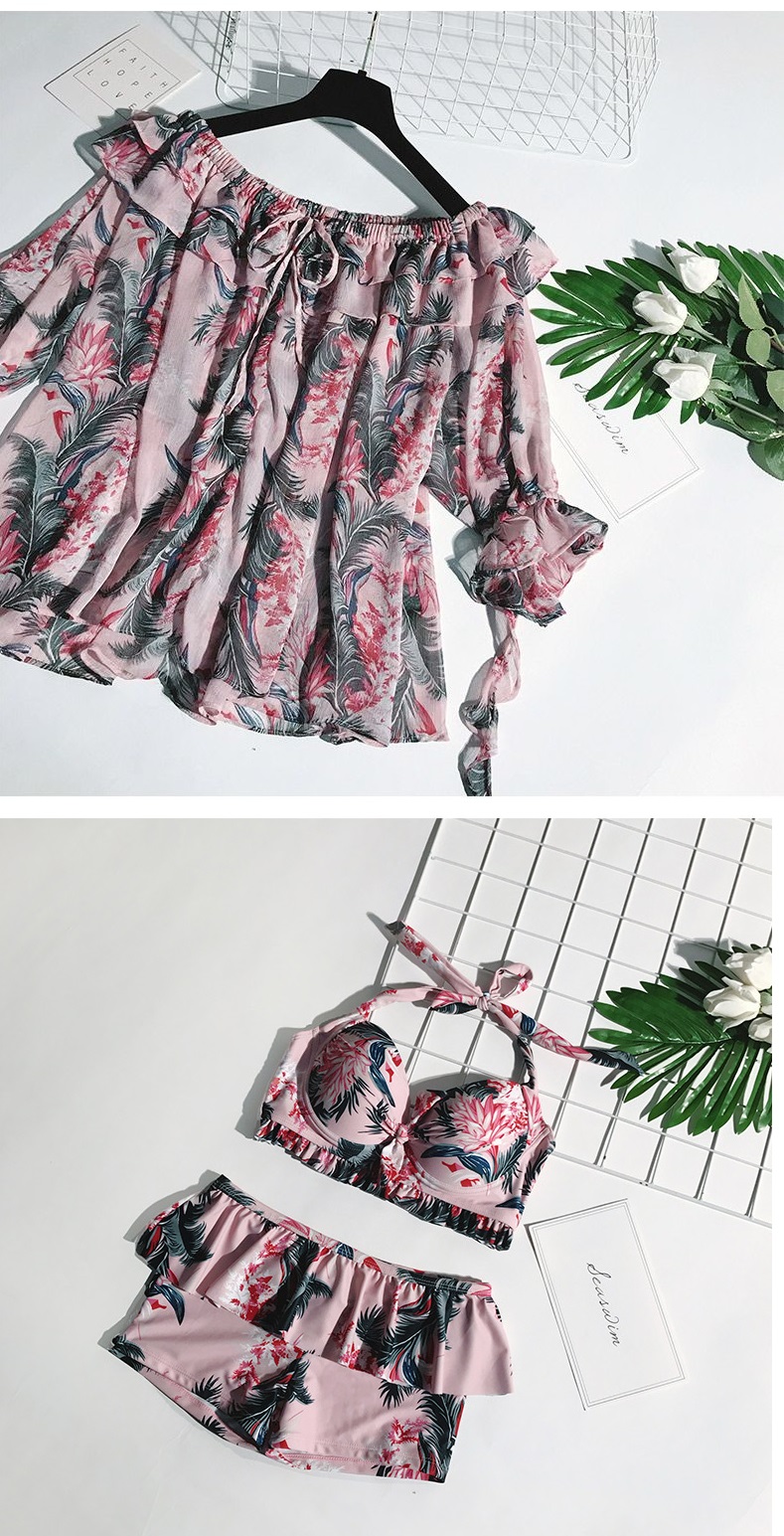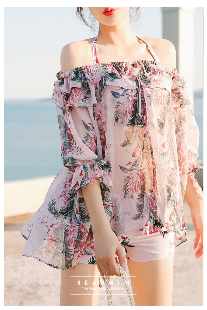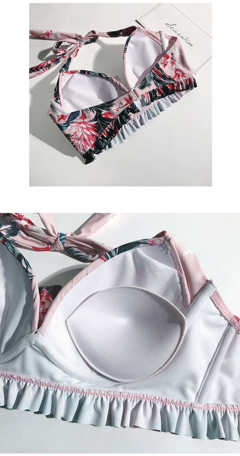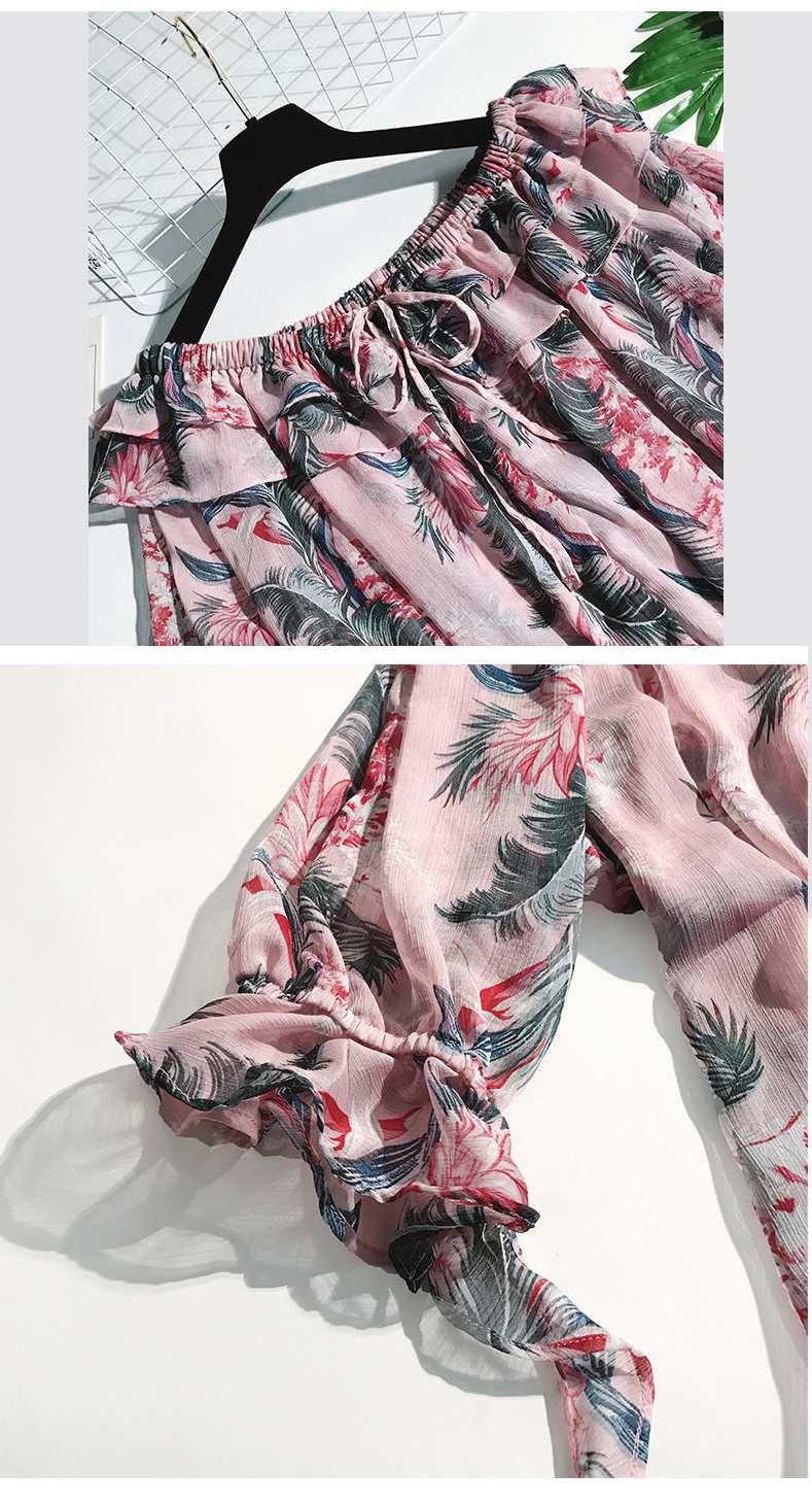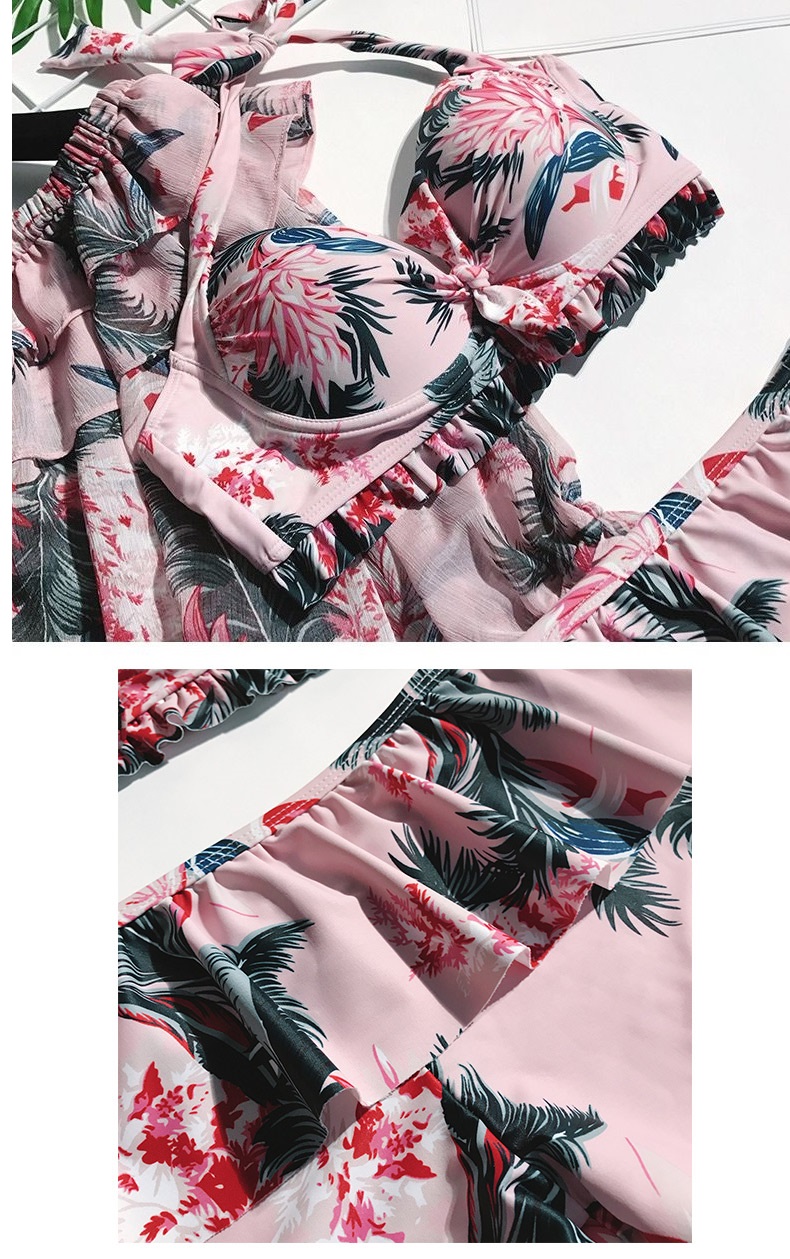 大人っぽいボタニカル柄とフリルがフェミニンなデザインです。