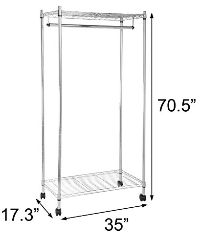 - Feature : Chrome Garment Rack with 2 locking wheels / Easy assembly (less than 15 minutes), no tools required / Garment Rack dimensions: 35 x 17.3 x 70.5 inches (LxWxH) / Covered under the AmazonBasics 1-Year Limited Warranty / Ships in Certified Frustration-Free Packaging