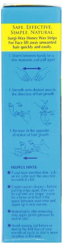 ReleaseDate : 2016-04-13 Studio : Surgi-wax Publisher : Surgi-wax Binding : Health and Beauty Product Description Discover the Easiest Hair Removal Method Available. Warm in hands for a few seconds, pull strips apart, apply and remove. It's that simple - No Mess, No Worries if the wax is too hot or not hot enough. Surgi-Wax Honey Wax Strips feature Maple Honey to firmly grasp fine and even short hair (1/8" is all you need) and remove it from the root. Two ready-to-use sizes allow you to choose the perfect size for upper lip, cheek, chin or brow. Stay Smooth and Hair-free for up to 6 Weeks! As our bonus to you, we have included a Free Soothing Gel with Aloe, Chamomile and Cucumber to soothe and moisturize skin after hair removal. Contains: 8 Small Strips (16 Applications), 8 Medium Strips (16 Applications) Soothing Gel (14 g net wt .5 oz) 0