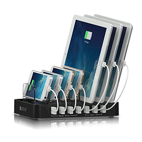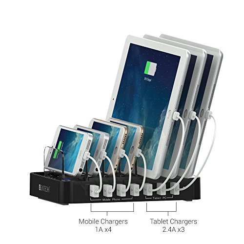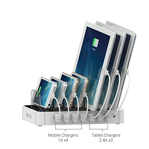 -. Feature : 7 Powered USB Ports (3 x 2.4A and 4 x 1A ) - Simply connect your own charging cable and this powerful charging station will charge up to 7 devices, including smartphones and high-powered devices such as tablets / Includes 7 Velcro straps for cable management - Keep your devices and cables organized / Organize up to 7 devices - 7 slots with anti-scratch silicone pads organize your devices even with the cases still on / Surge protection on each port - Built-in smart charging chipset provides determines the charge needed for your device, delivering a steady and safe charge / Power in a compact space - At 7.4 x 5.5-inches, this charging station packs power without taking up precious space on your desk