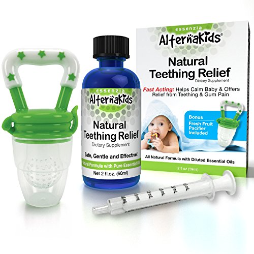AlternaKids Natural Teething Relief is a simple, safe and fun way for your little baby or toddler to receive relief from pain associated with teething, sore gums and toothaches. This all-natural teething blend provides pain relief while treating restlessness, irritability and agitation. AlternaKids Natural Teething Relief is a great-tasting, easy-to-administer oral solution that gets to the source quickly to help soothe your baby's discomfort.* All natural formula with pure essential oils, no artificial flavor, color or preservatives. This formula contains a diluted blend of gentle herbal extracts and pure essential oils which have been used safely for centuries to temporarily alleviate swelling, pain & inflammation caused from teething, gum pain and toothaches.* Simple, Pure Formula with 8 Natural Ingredients: Coconut Oil, Sunflower Oil, Grapeseed Oil, Grapefruit Seed Extract, Peppermint, Clove, Chamomile, Vitamin E Parents will love the simplicity of using AlternaKids Natural Teething Relief, and when used along with the Fresh Fruit Pacifier children will enjoy the temporary relief and tasty little snack. Suggested Use: Shake well. Wash hands. Using finger gently massage 1 (0.5ml) drop on baby's gums to help relieve teething pain and soothe baby. To Make It Fun... using the included AlternaKids - Fresh Fruit Pacifier mix your child's favorite fruit or soft snack with 1 (0.5ml) of AlternaKids - Natural Teething Oil. Place in freezer for 15 minutes for the extra relief of a chilled snack.Feature