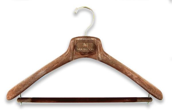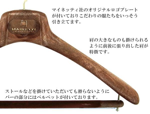 メンズハンガーとほぼ同じ形ですが、肩先(両端)を太くしたコートハンガー。コートのような肩の大きなものも掛けられるように前後に張り出した肩が特徴です。お好みでジャケットを掛けることもでき、バーの部分にはストールなどを掛けることもできます。 |