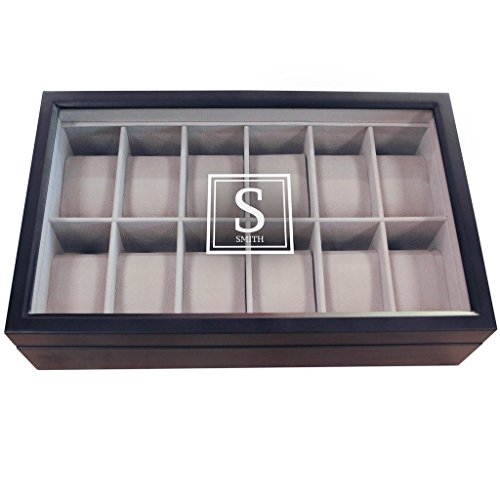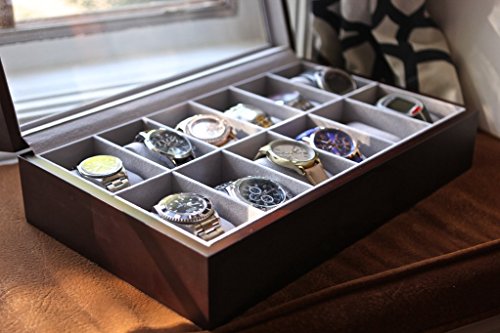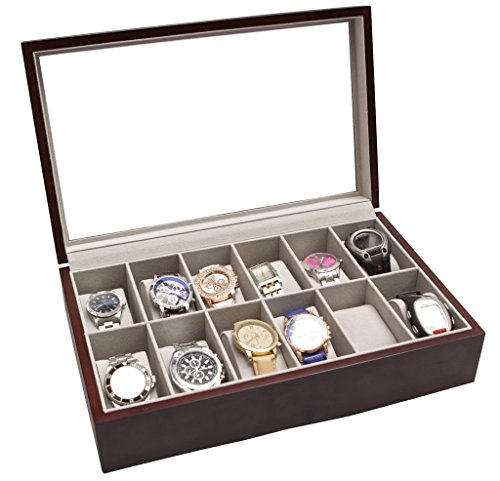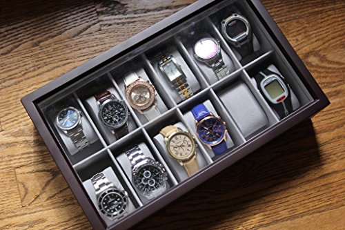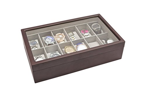 -. Title : Solid Espresso Wood Watch Box Organizer with Glass Display Top 12 slot by Case Elegance