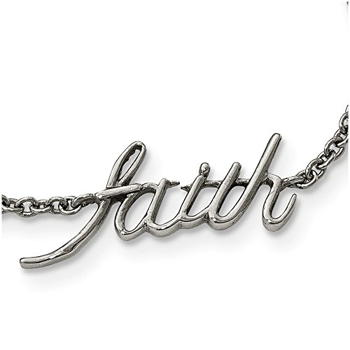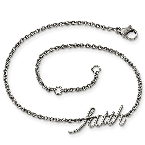 Anklets are a great way to add fun, flash and a feminine touch. This adjustable 9 or 10-inch ankle bracelet is crafted from polished stainless steel, a contemporary metal that will not tarnish. It features a 10 x 25mm faith script charm stationed on a 2mm width cable chain that is finished with a fancy lobster clasp.Feature
